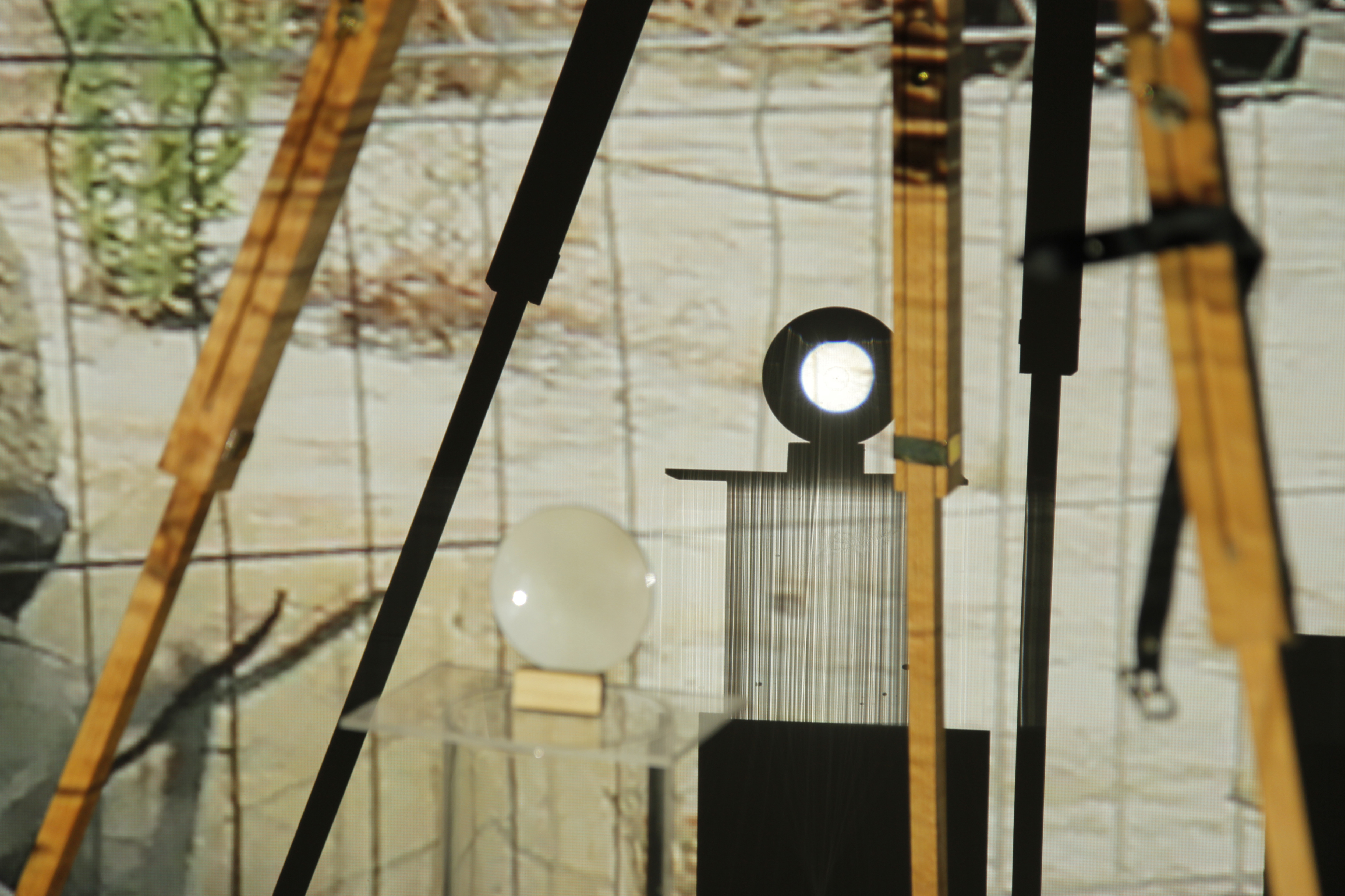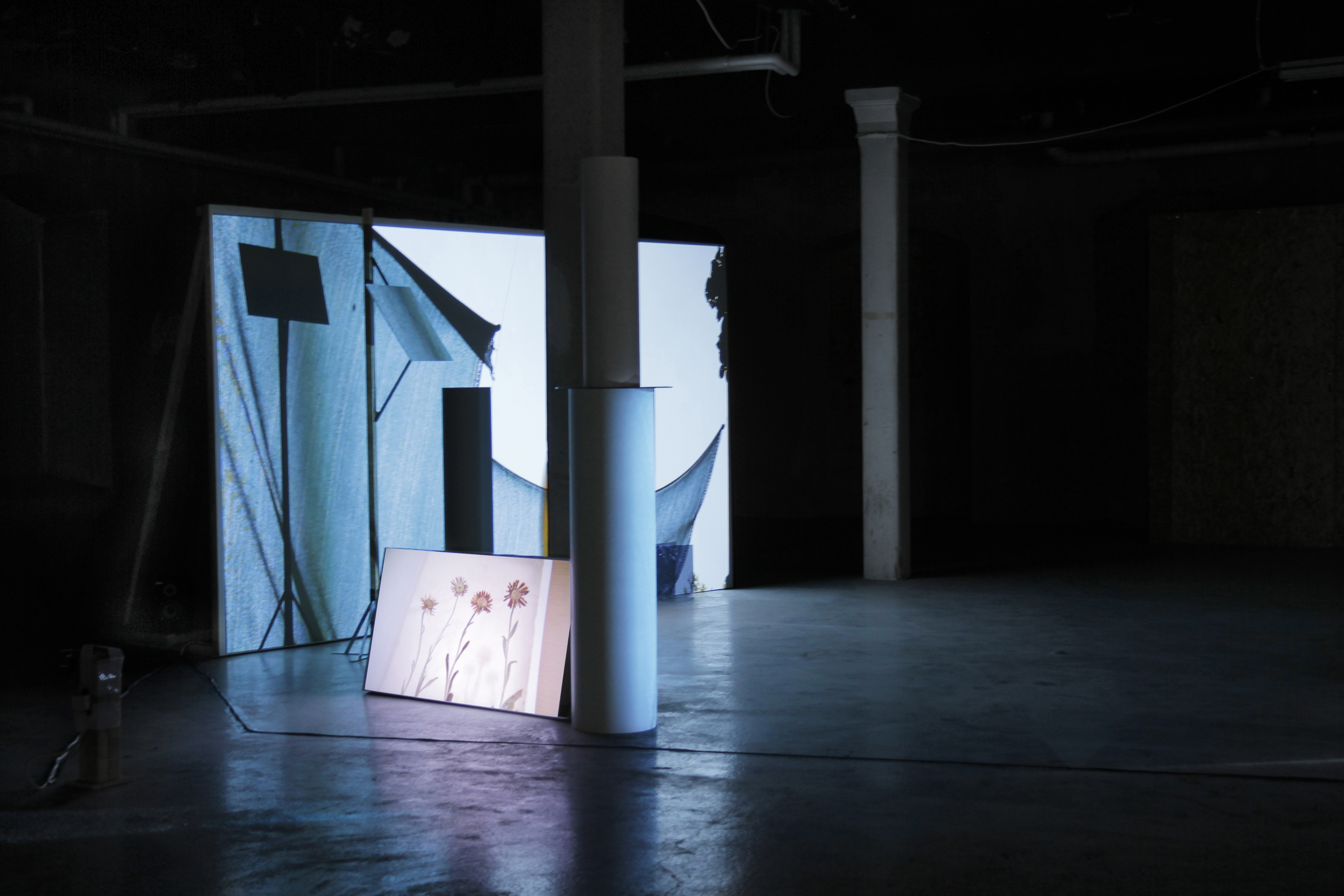 The filmed images are projected on screens in different formats and in front of them, in the image; sculptures and objects are placed, which can be seen as props- as if the viewer is part of something ongoing. Films are being screened, but at the same time the exhibition space is created in the moment, a new stage for other things that may take place.