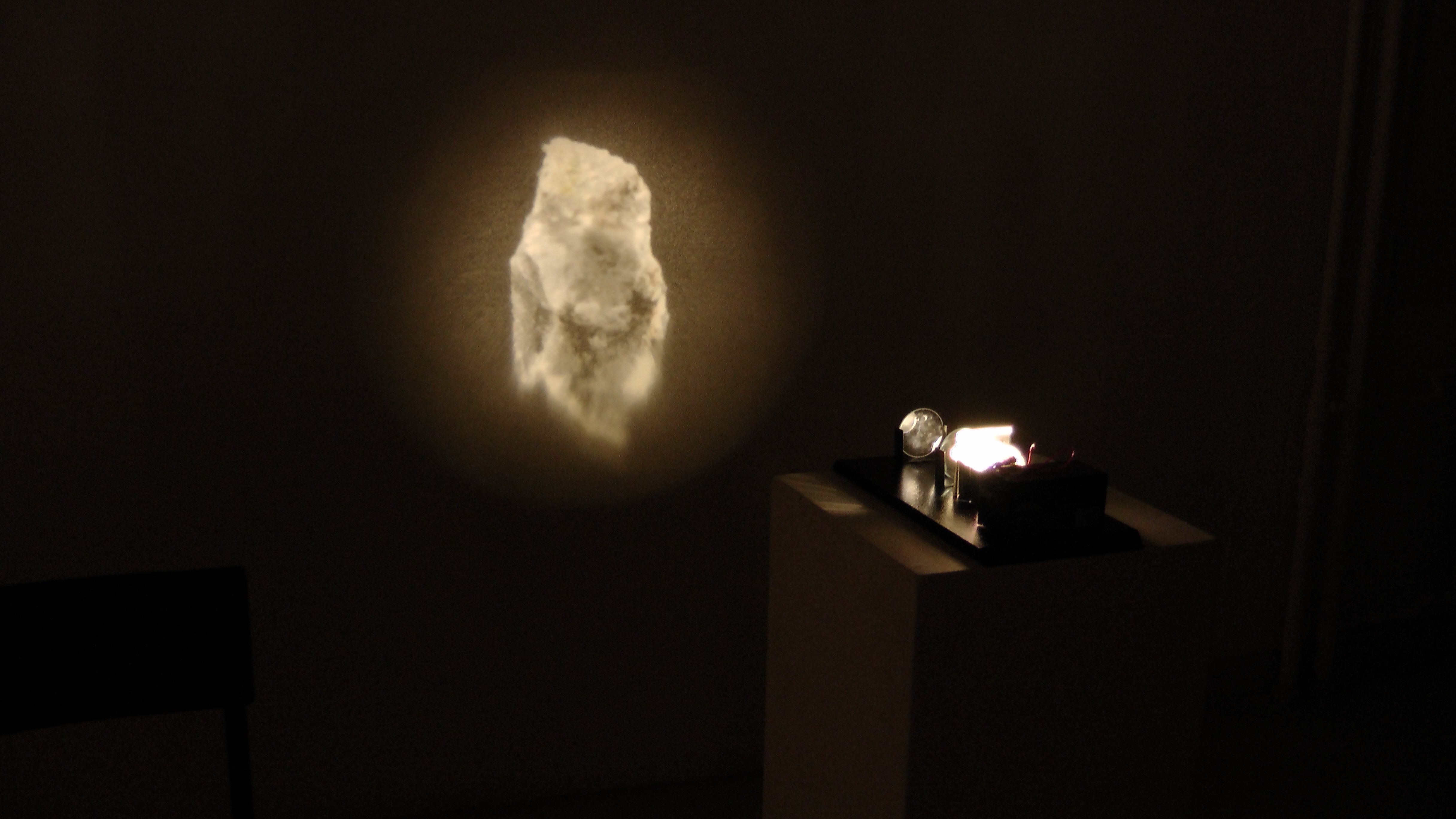 Stone (no. 5 of 9) Dec. 2010 "Qalandya" is a light installation whose construction is taken from the 18th century Laterna Magica. Unlike the original which was built into a box, this work shows the whole process as the light passes through lenses from its light source to the projected image, visible to the viewer. Qalandya is a military checkpoint in Ramallah, Palestine, and the photographed stone projected is one of several stones retrieved from there.